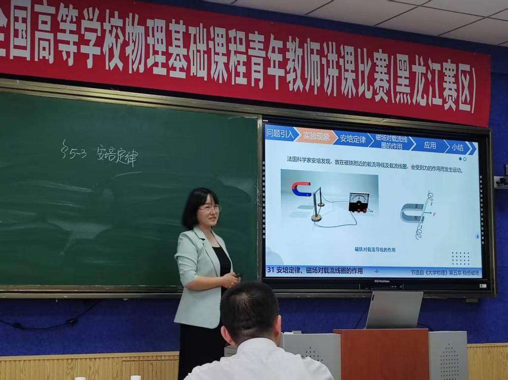 该项比赛旨在激发和鼓励青年教师投身物理基础教学,提升教学水平、推动教学内容、手段的改革和教学经验交流,提高人才培养质量。希望通过讲课比赛将教改成果落地到一线教学环节的“最后一公里”,把先进的和代表未来的教学理念、教学模式、教学方法传递给高校基础物理青年教师,为国家培养未来一代的物理教育教学大师。本轮省赛有来自哈尔滨工业大学、哈尔滨工程大学、东北林业大学等高校的10名青年教师参加,比赛难度大,水平高,参赛选手需要在60个题目中抽选1个进行现场讲授,经过激烈的角逐,最终我校物理科学与技术学院教师虞佳获得一等奖。