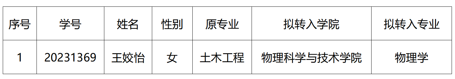 依据《黑龙江大学关于做好2024年本科生选拔转专业工作的通知》要求,按照《物理科学与技术学院2024年选拔转专业工作方案》的相关安排,经学生个人申请、转出及转入学院资格审查、笔试、面试环节,现将考试合格及拟接收转专业学生名单公示如下: