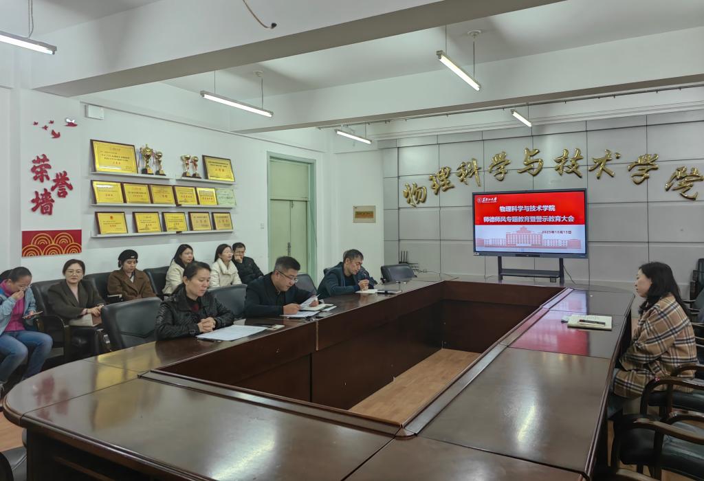 为深入贯彻落实立德树人根本任务,强化教师责任意识、规矩意识和育人担当,规范教师职业行为,强化纪律约束,发挥典型案例警示教育作用。物理科学与技术学院于10月15日在实验楼会议室召开师德师风专题学习暨警示教育大会。学院领导班子成员、全体教职工参加会议,会议由学院党委书记李云风主持。