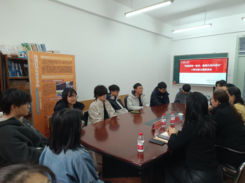 为铸牢中华民族共同体意识教育,促进各民族学子交往交流交融,3月26日下午,物理科学与技术学院于实验楼210-1室召开“民族团结一家亲 融情交流共成长”主题座谈会。学工部少数民族专职辅导员阿孜古丽莅临指导,党支部副书记邢有男,学院各年级辅导员、少数民族学生代表参会,会议由王鹏达主持。