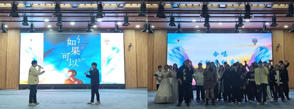 临近尾声,翟晓萌同学的《星辰大海》以悠远歌声传递追梦力量,激励新生奔赴未来;王瑞琪同学的《如果可以》则用动人嗓音倾诉青春情愫,触动听众心弦。最后,全场大合唱《相亲相爱》将温情与欢乐推向顶点,为晚会画上圆满句号。