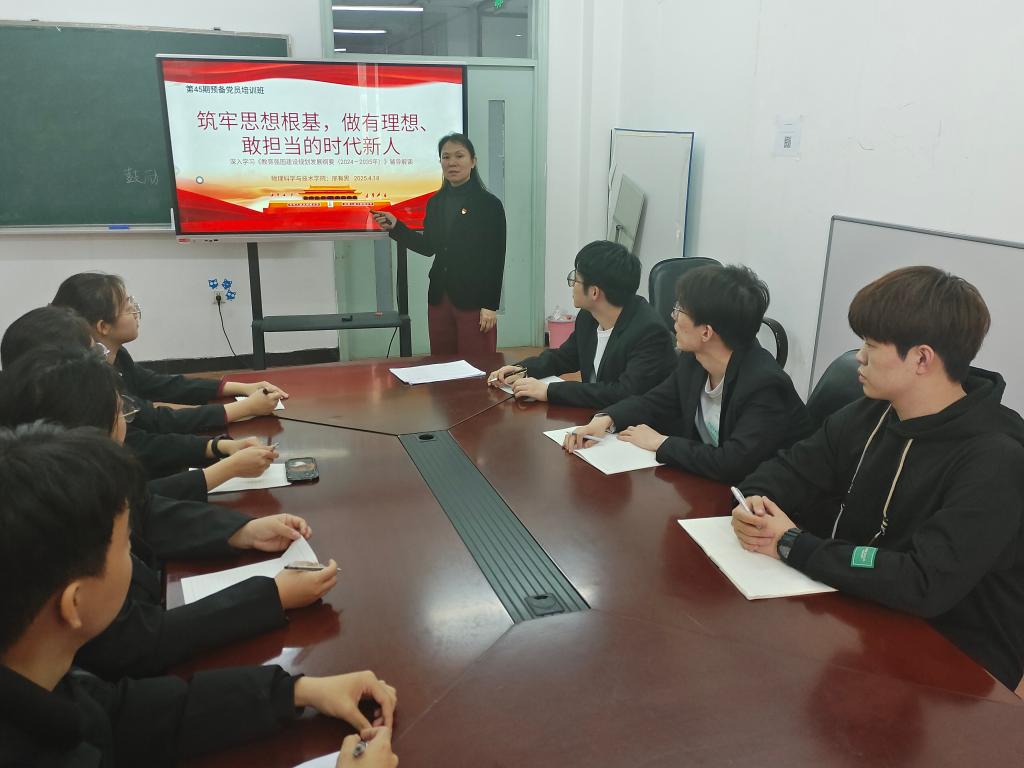 为进一步贯彻落实党的二十届三中全会精神,深入贯彻中央八项规定及其实施细则精神,夯实学生党员先锋工程,提高学生党员学习理论和贯彻党的路线方针政策的自觉性。根据学生工作部《关于举办第45期学生预备党员培训班的通知》,物理科学与技术学院于2024年4月16-22日期间举办第45期学生预备党员培训班,本次培训由学院党总支副书记邢有男,学院团委书记李佳睿分别授课,全体预备党员参加。