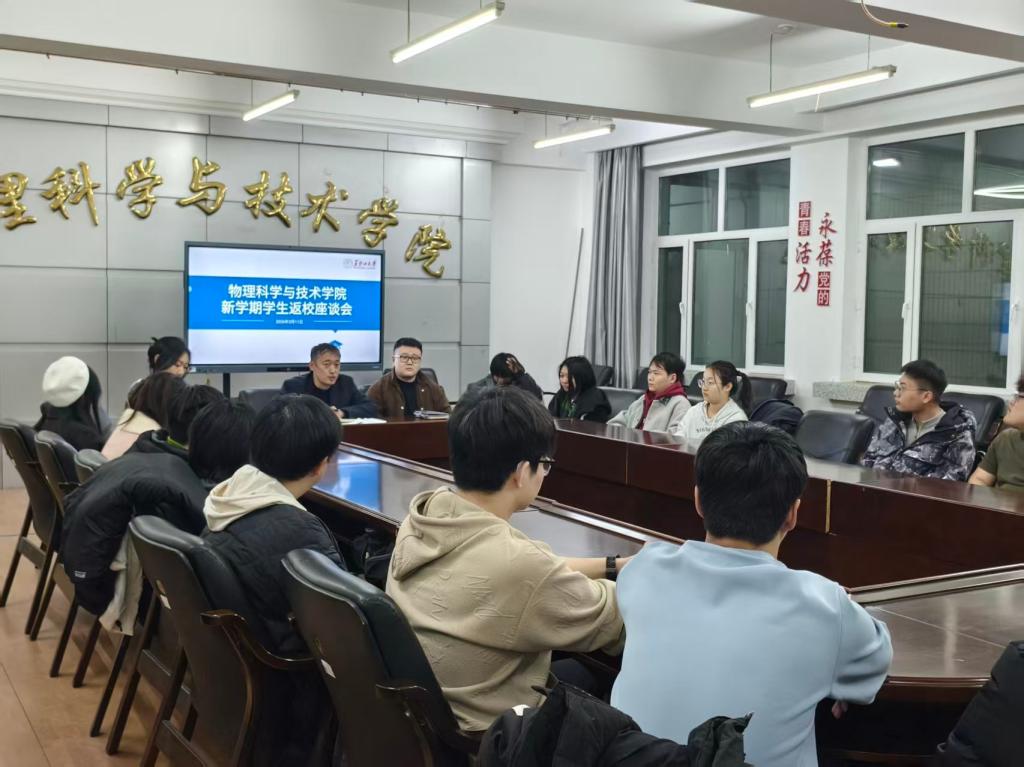 为深入学习贯彻党的二十大和二十届历次全会精神,持续推动习近平新时代中国特色社会主义思想入脑入心,扎实做好新学期学生教育管理工作,引导学生坚定理想信念、明确发展目标、端正学习态度,以昂扬向上的精神风貌开启新学期学习生活,3月11日、12日,物理科学与技术学院在实验楼216室分年级召开学业指导教育座谈会。学院院长姜子实,各年级辅导员及学生代表参会。